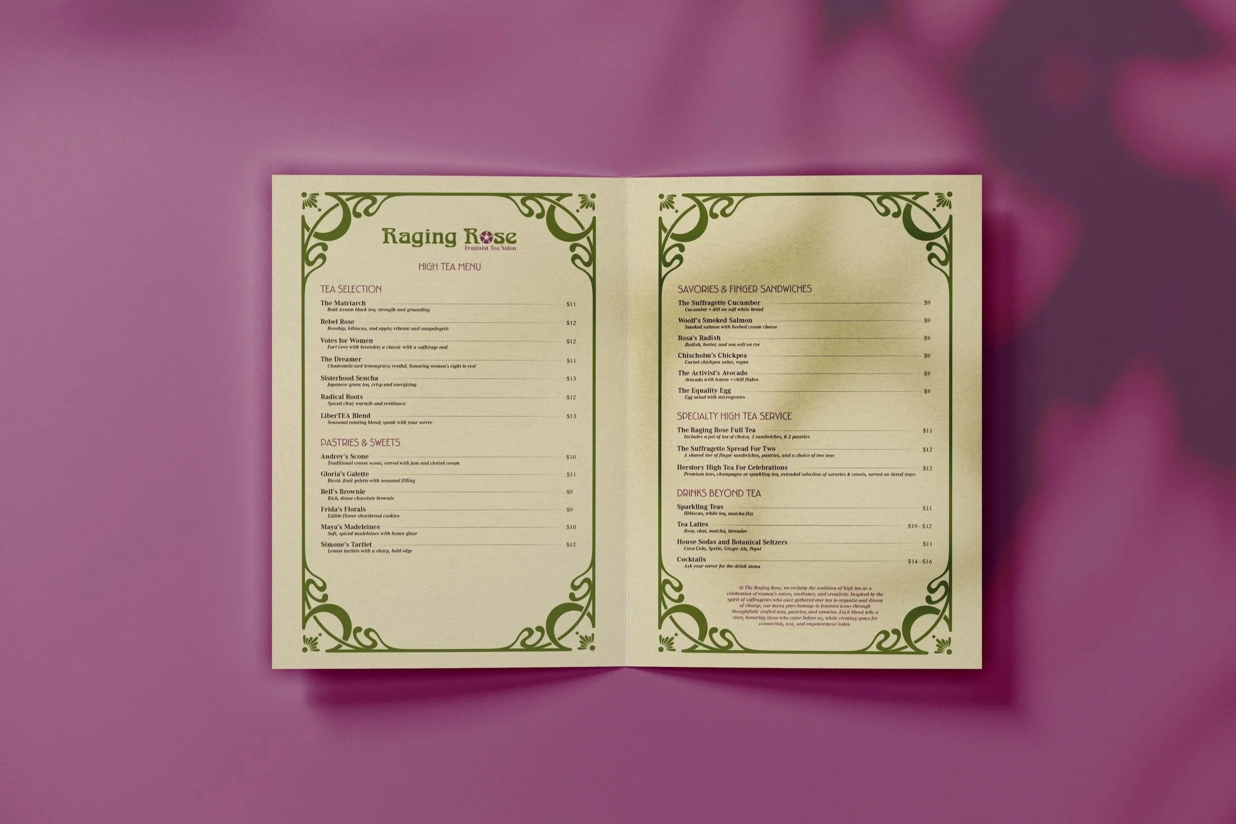 The Raging Rose is a a modern high tea house that reimagines the tradition of tea service through a feminist lens. Guests enjoy artisanal teas and pastries named after feminist icons, presented in a stylish space that celebrates women’s voices and stories. Every detail from the menu to the design, celebrates women’s creativity, history, and power, primarily during the suffrage movement.